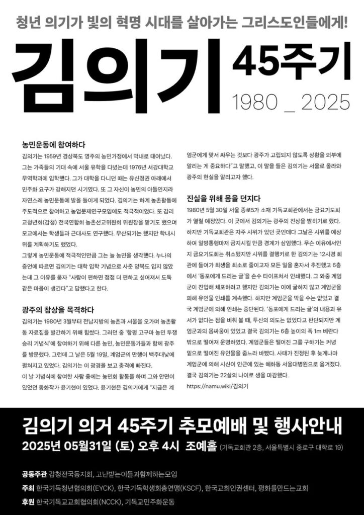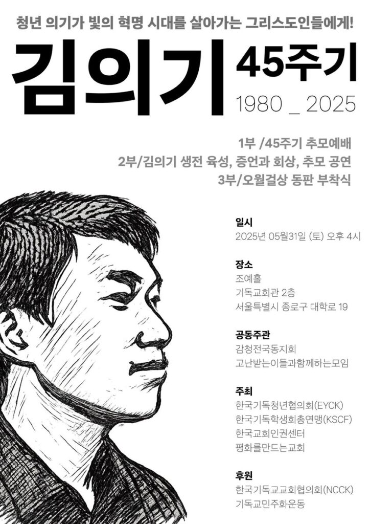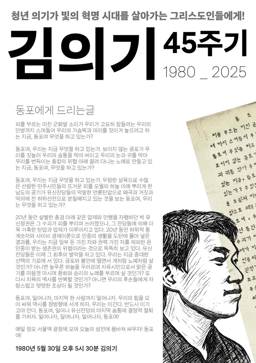 2025년 5월 31일(토) 김의기 의거 45주기 추모식 By 윤 하영2025년 05월 29일2025년 06월 15일공연 일정 김의기 45주기 추모식에 이소선합창단이 함께 합니다. “오월의 노래2″와 “군중의 함성”으로 추모의 마음을 담아냅니다.