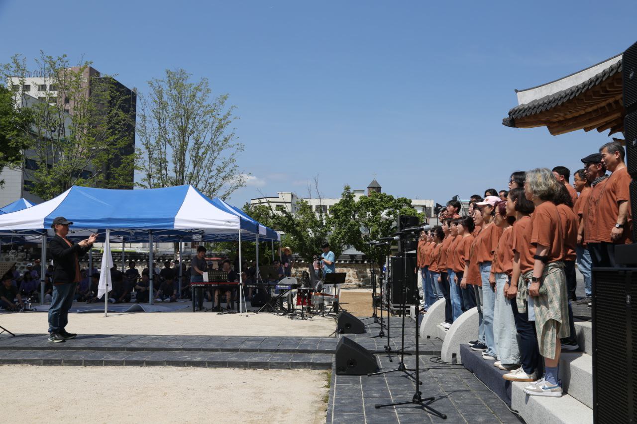 그리고 다음 날인 6월 15일, 전라감영 특설무대에 다시 섰습니다. 전라감영은 1392년 조선 건국과 함께 설치되어 전라도의 정치·행정 중심지로서 500년 이상 기능해 왔고, 동학농민군이 개혁의 중심기구를 설치한 역사적 장소이기도 합니다. 복원된 전라감영과 그 특설무대는 과거와 오늘, 권력과 시민, 통치와 연대를 잇는 상징 공간으로 거듭나며 시민들이 함께 모여 노래하고 기억하는 문화적 민주주의의 현장이 되었습니다.