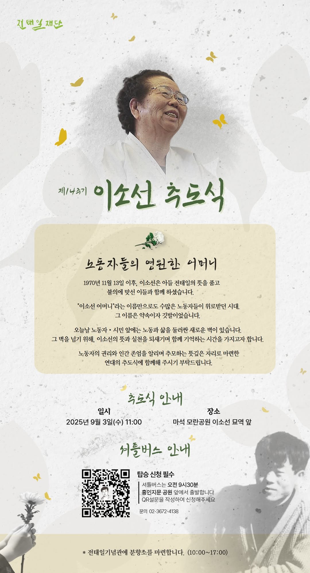 어머니의 뜻과 정신을 노래로 잇고자 합니다. 1970년 전태일 열사의 정신을 품고, 그 길을 이어간 이소선 어머니. 많은 분들과 함께 어머니의 삶과 정신을 기억하고, 노동과 민주, 인권의 가치를 함께 새기는 자리가 되길 희망합니다.