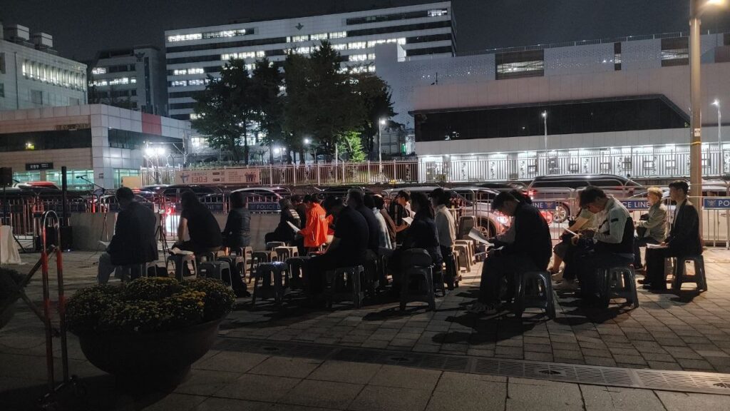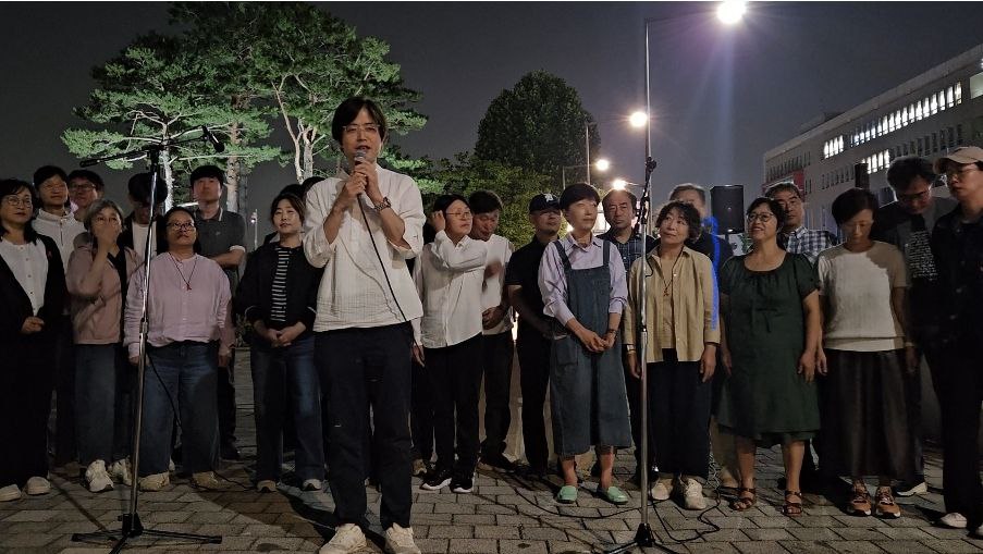 기도로 노래를 소개하며 사회자는 말했습니다. “주님, 이곳에 모여 위로하고 함께 투쟁하는 이 시간과 공간을 허락해주셔서 감사합니다… 우리의 노래와 함성을 들어주시고, 인간의 시간 안에서도 하루빨리 이 모든 것이 해결되도록 인도해 주시옵소서. 아멘. 이제, 군중의 함성 함께하겠습니다.”