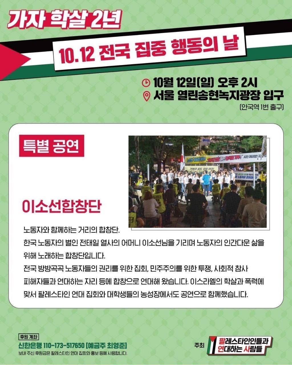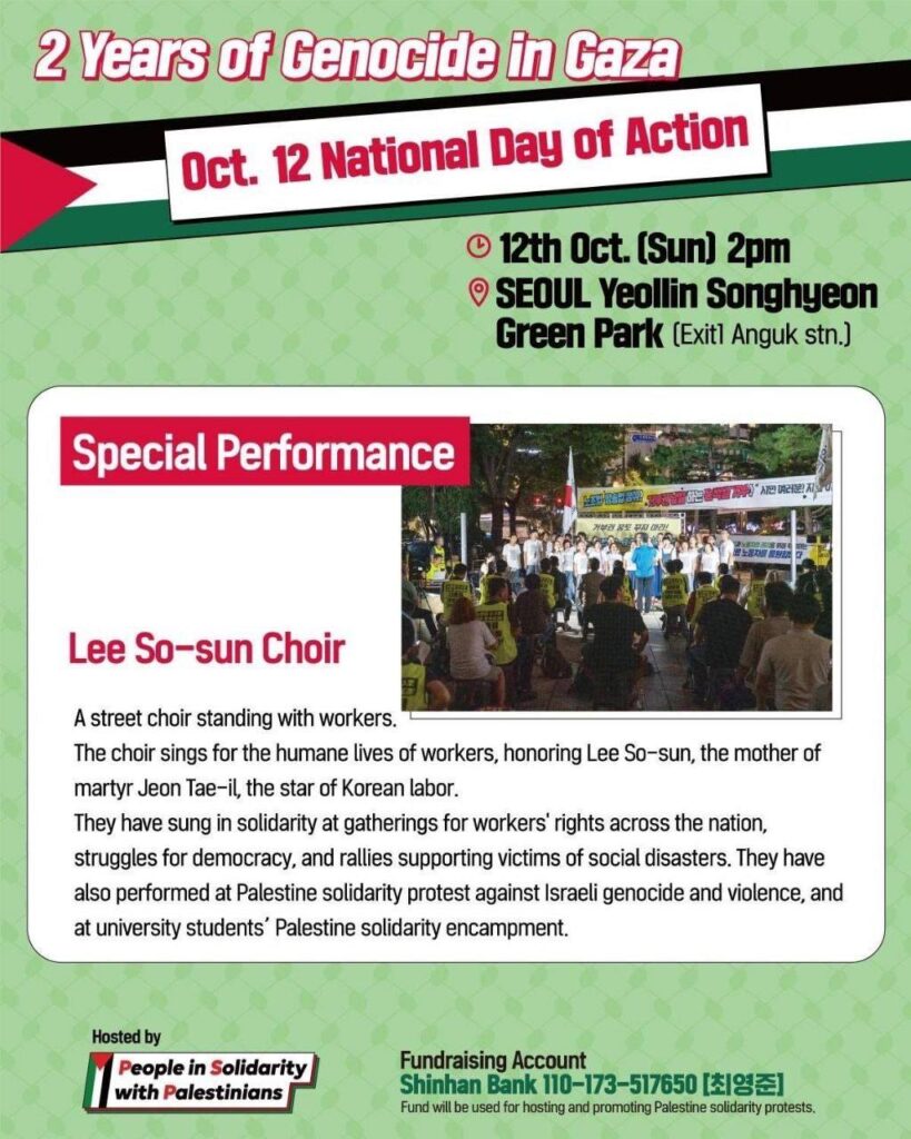 노동자와 함께 노래하는 거리의 합창단, 이소선합창단이 ‘가자 학살 2년, 10.12 전국 집중 행동의 날’ 현장에서 특별공연으로 함께합니다. 이소선합창단 은 팔레스타인 학살과 폭력에 맞서 싸우는 사람들과 연대하며 노래로 마음을 모읍니다.