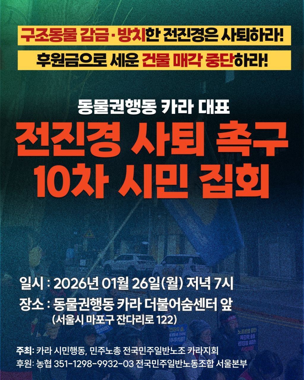 2026년 1월 26일(월) 카라 노조 투쟁 연대 공연 By 윤 하영2026년 01월 24일2026년 01월 24일공연 일정 이소선합창단은 동물권행동 카라 노동자들의 정당한 투쟁에 연대하며 전진경 대표 사퇴 촉구 10차 시민집회 현장에서 연대공연으로 함께합니다. 일시 : 2026년 1월 26일(월) 저녁 7시 장소 : 동물권행동 카라 더불어숨센터 곡목 : 천리길, 그날이 오면, 진군의 노래( 지휘 : 임정현, 피아노 : 정효) 함께 모여 외치고, 함께 노래하며 바꿉니다. 연대의 자리에서 뵙겠습니다. 0
