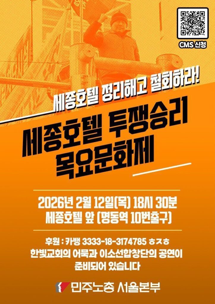 침묵과 방관 속에선 문제가 해결되지 않습니다. 2월 12일 세종호텔 앞에서는 오후부터 연대의 온기가 차곡차곡 쌓일 예정입니다.
