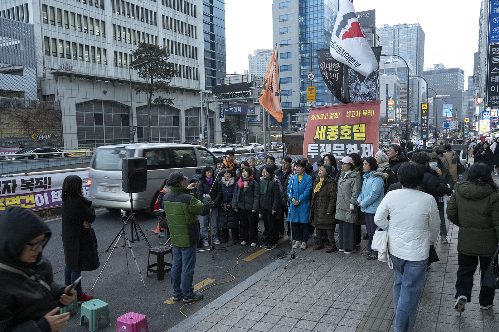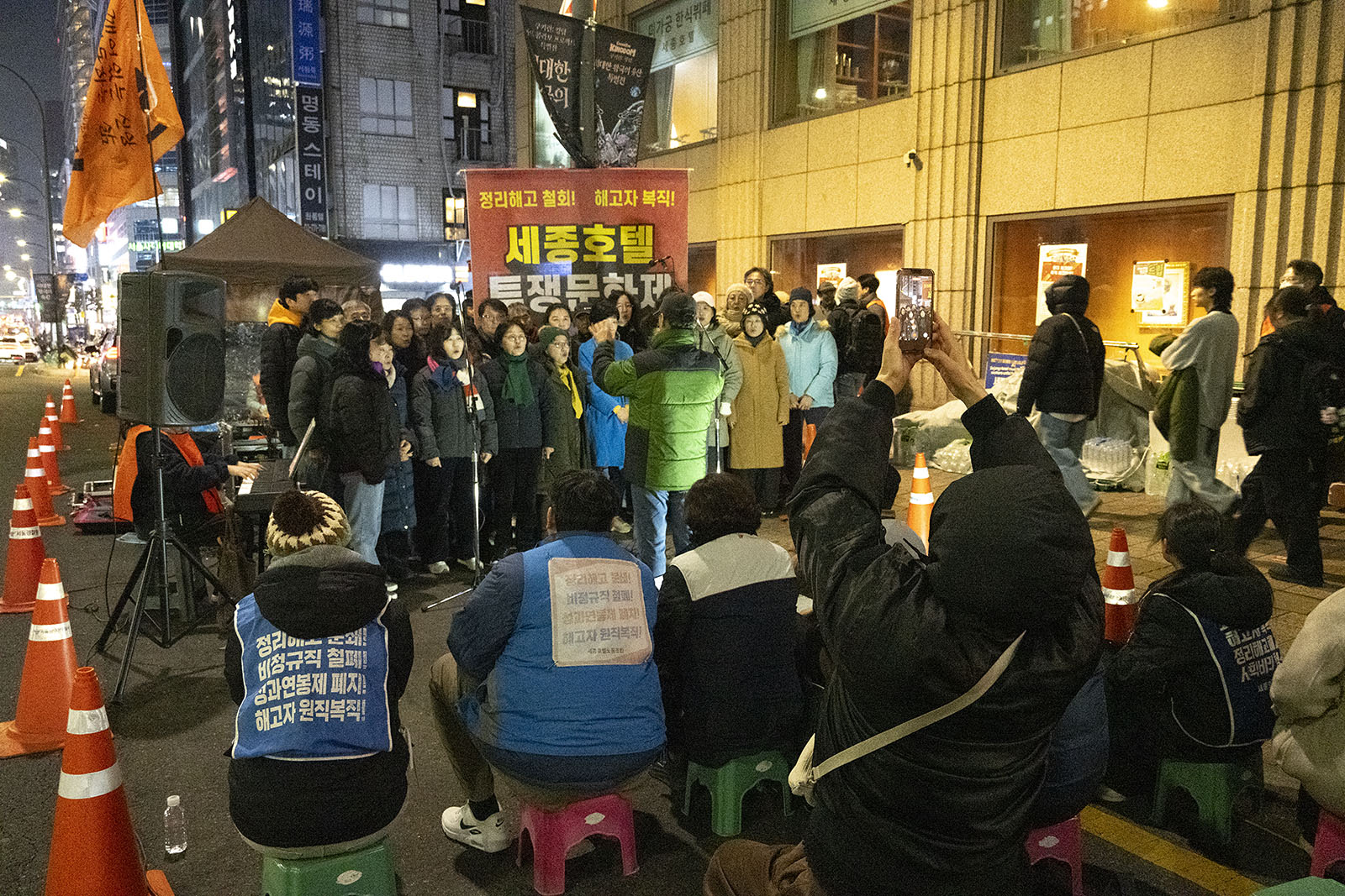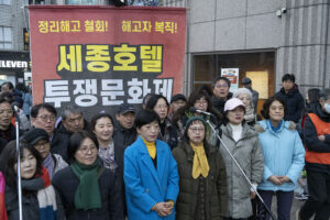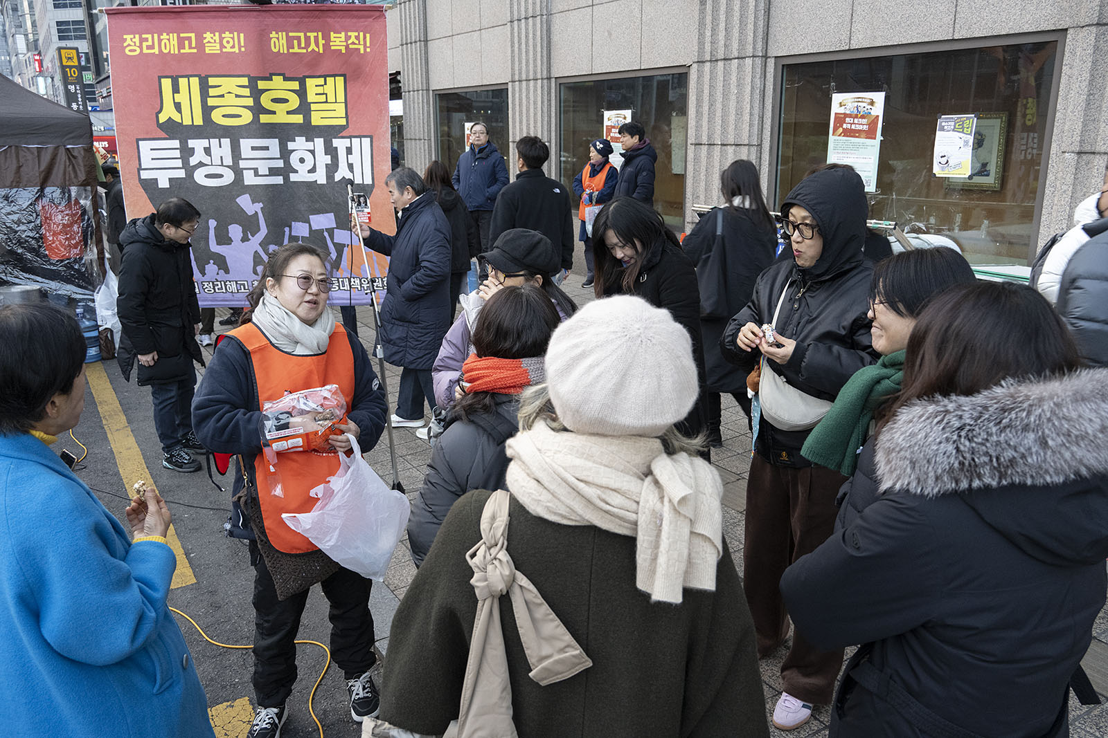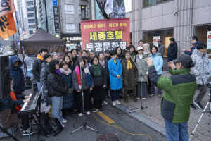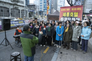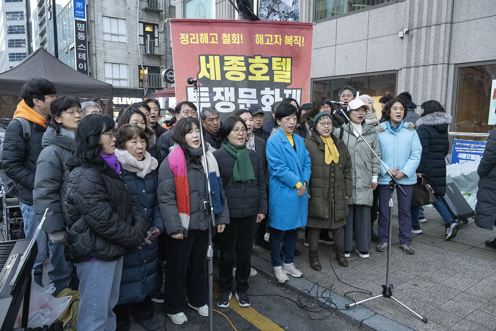 명동의 풍경은 매일 비슷하게 반복된다. 한국을 찾은 수많은 외국 관광객들과 내국인들이 뒤섞이고 그들에게 물건을 파는 상인들이 매일 비슷하게 되풀이되는 그 풍경을 만들어낸다. 그러나 명동의 목요일은 다르다. 목요일의 풍경이 다른 것은 명동역의 10번 출구를 나가 세종호텔 앞에서 만나는 집회가 그 날 있기 때문이다. 세종호텔 앞의 집회는 목요일이면 어김이 없다. 부당한 해고로 세종호텔에서 쫓겨난 노동자들의 집회이다. 2026년 2월 12일 목요일에도 지나는 사람들에게 세종호텔 투쟁문화제임을 알리는 이 집회는 어김이 없었다. 노동자들은 해고자의 원직복직을 위해 힘을 모아 싸우고 있다. 집회는 다시 직장으로 돌아가기 위한 노동자들의 투쟁 현장으로 보인다. 겉으로 보이는 싸움의 현장은 그렇다.