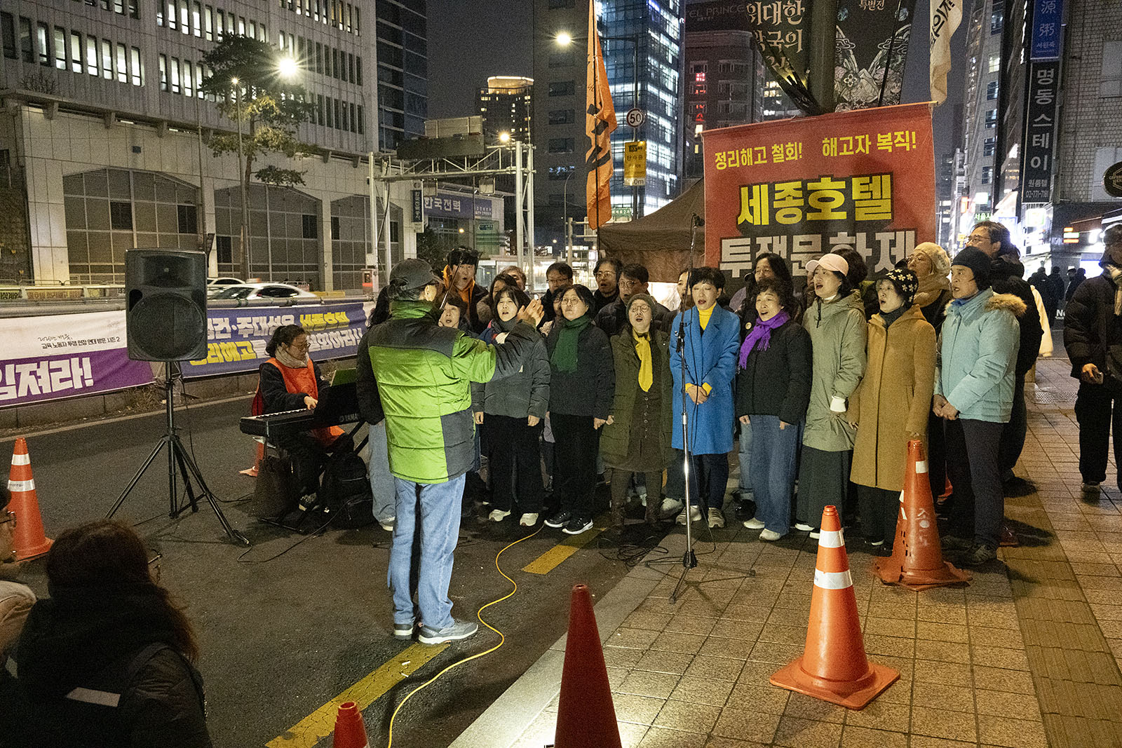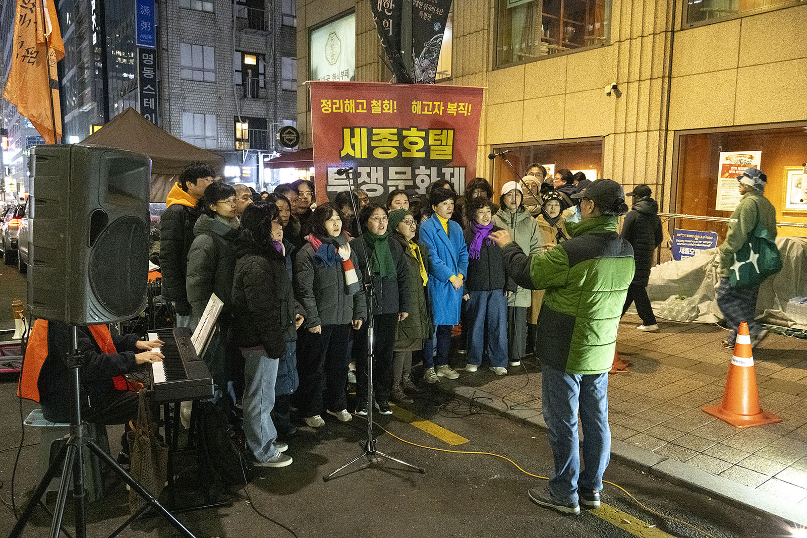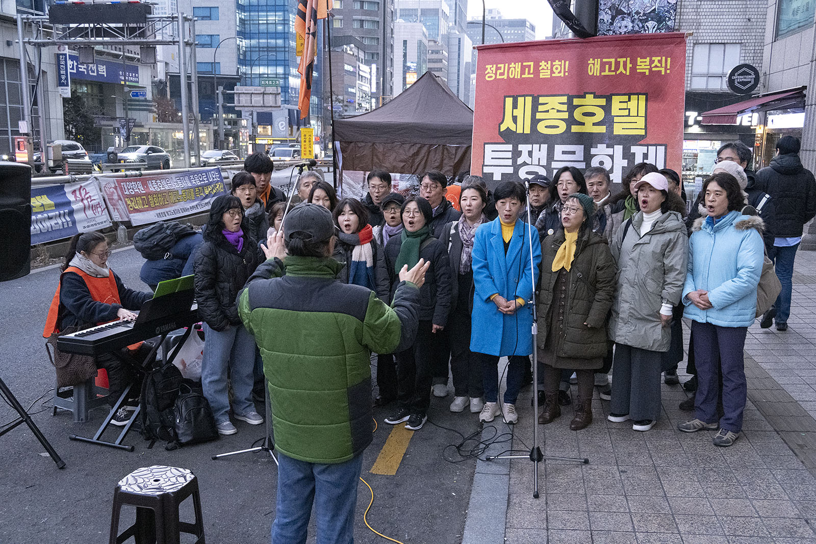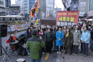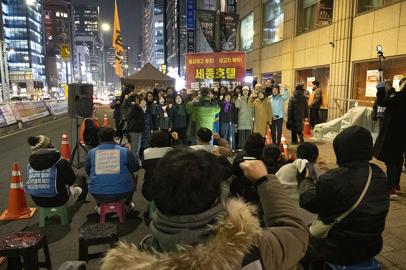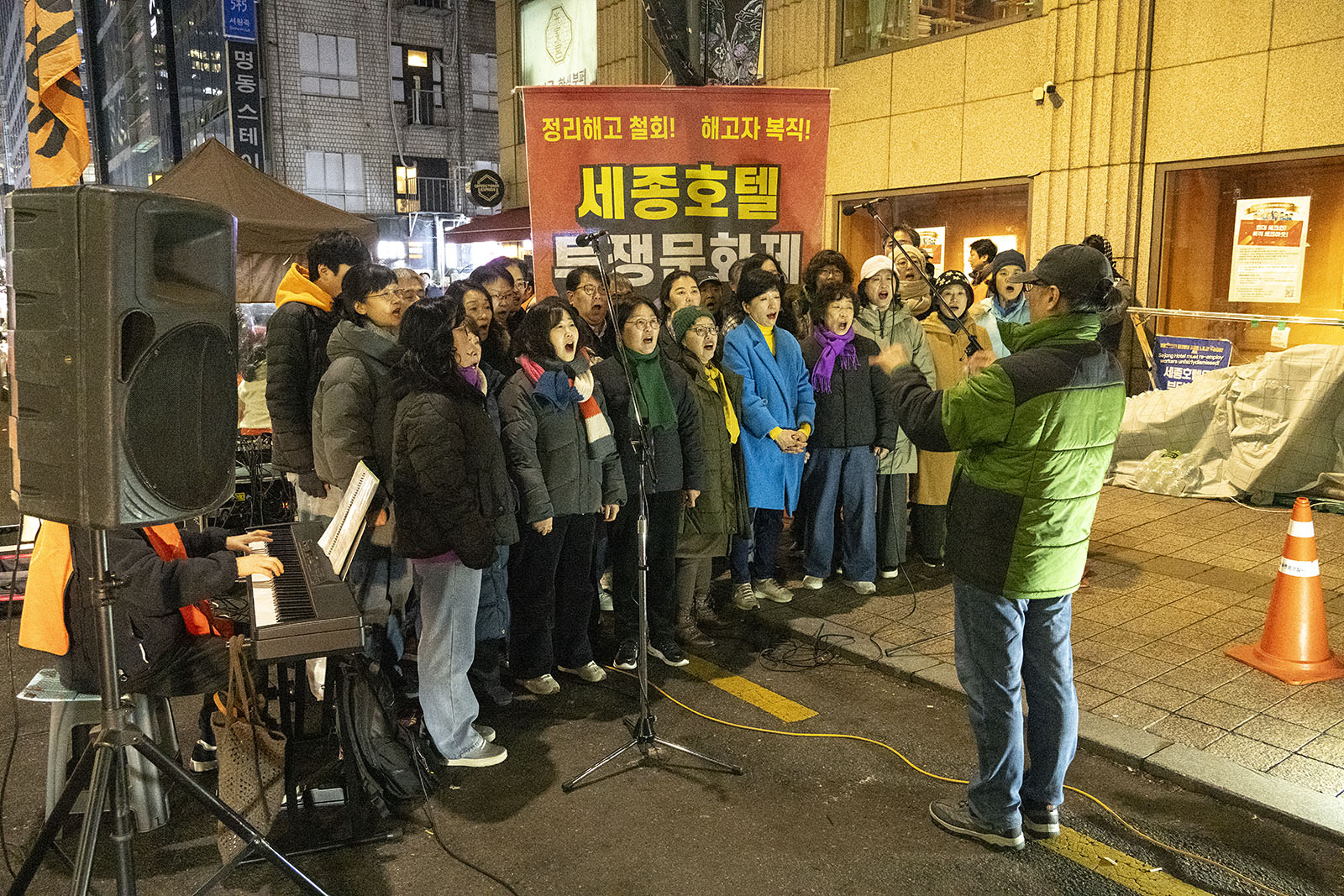 명동의 풍경은 매일 비슷하게 반복된다. 한국을 찾은 수많은 외국 관광객들과 내국인들이 뒤섞이고 그들에게 물건을 파는 상인들이 매일 비슷하게 되풀이되는 그 풍경을 만들어낸다. 그러나 명동의 목요일은 다르다. 목요일의 풍경이 다른 것은 명동역의 10번 출구를 나가 세종호텔 앞에서 만나는 집회가 그 날 있기 때문이다. 세종호텔 앞의 집회는 목요일이면 어김이 없다. 부당한 해고로 세종호텔에서 쫓겨난 노동자들의 집회이다. 2026년 2월 12일 목요일에도 지나는 사람들에게 세종호텔 투쟁문화제임을 알리는 이 집회는 어김이 없었다. 노동자들은 해고자의 원직복직을 위해 힘을 모아 싸우고 있다. 집회는 다시 직장으로 돌아가기 위한 노동자들의 투쟁 현장으로 보인다. 겉으로 보이는 싸움의 현장은 그렇다.