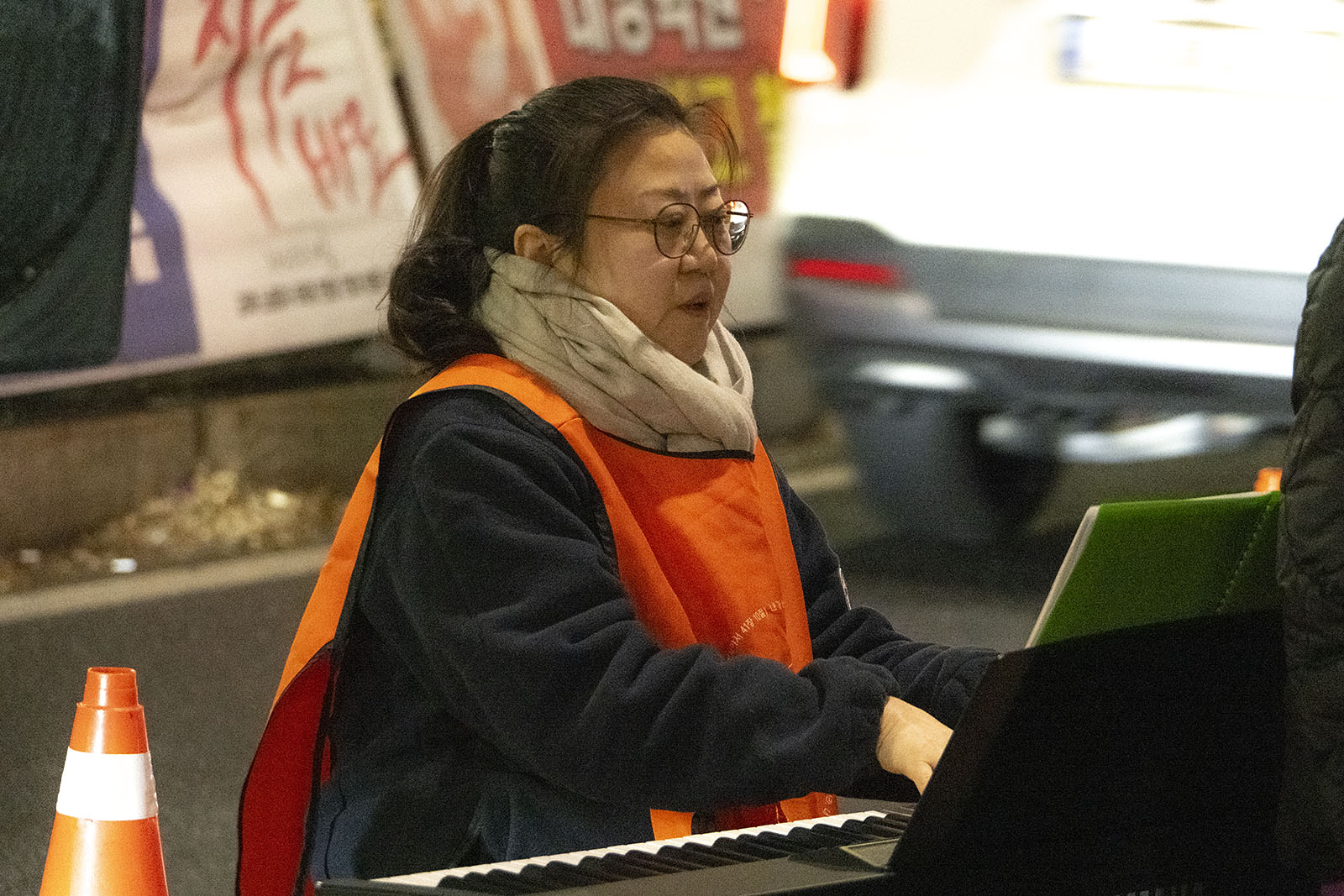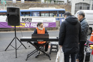 이소선합창단은 이 아름다운 노동자들의 집회에 노래로 함께 했다. 처음 부른 노래는 <이름>이었다. 노래는 “어둠 속 빛보다 찬란”한 것이 있으며 그 이름의 주인공이 바로 ‘노동자’라고 알려준다. 노래는 그 노동자가 “역사의 줄기”이자 “미래의 이름”이라 말하며 우리 삶의 방향을 어제부터 내일까지 관장하고 있음을 알려준다. 우리의 세상은 모두 노동이 알려주는 방향으로 가야 한다. 노래의 앞에 자본의 욕심이 흔들어 놓은 사회의 방향을 바로 잡기 위한 싸움에 나선 노동자들이 앉아 있었다.