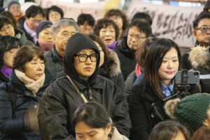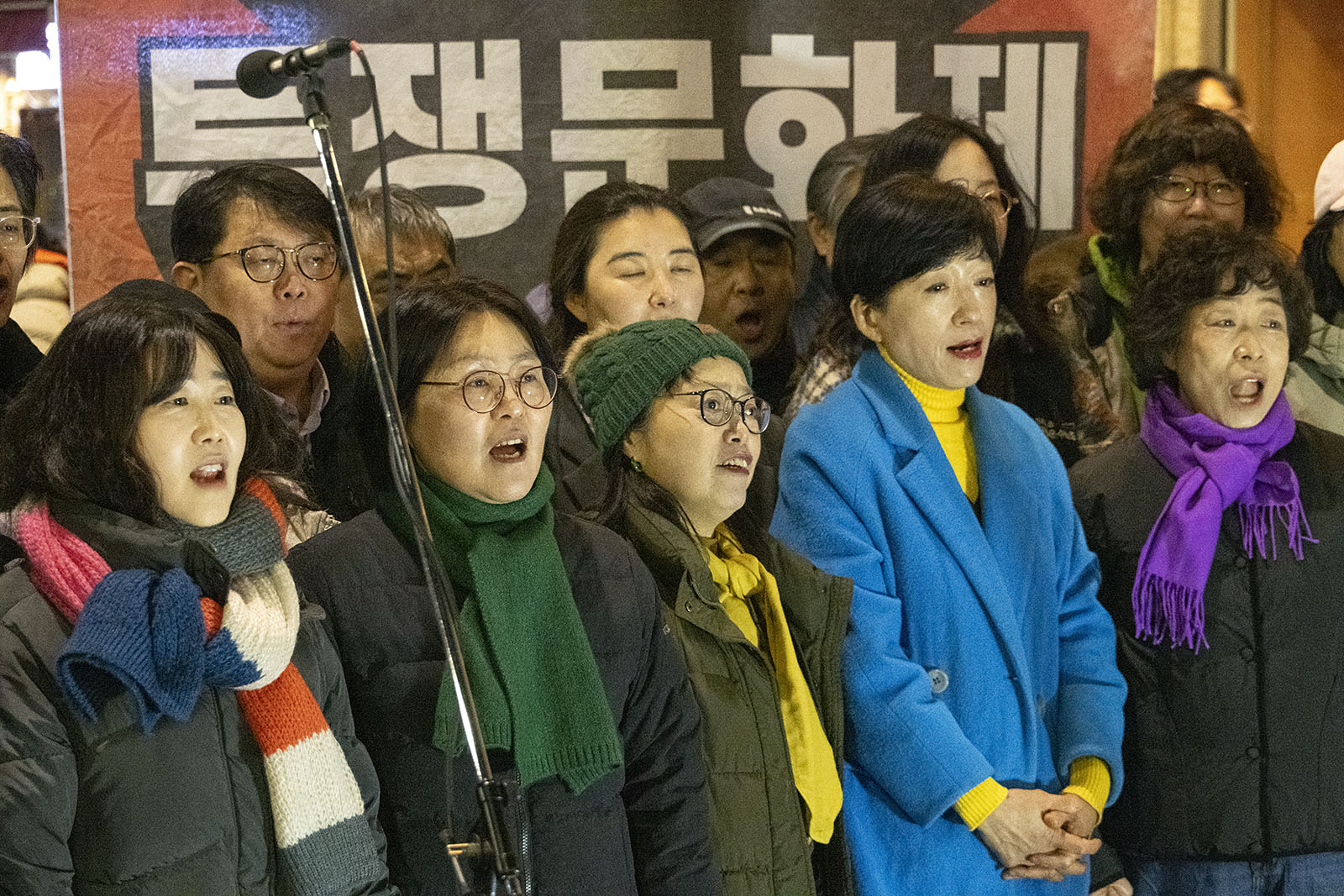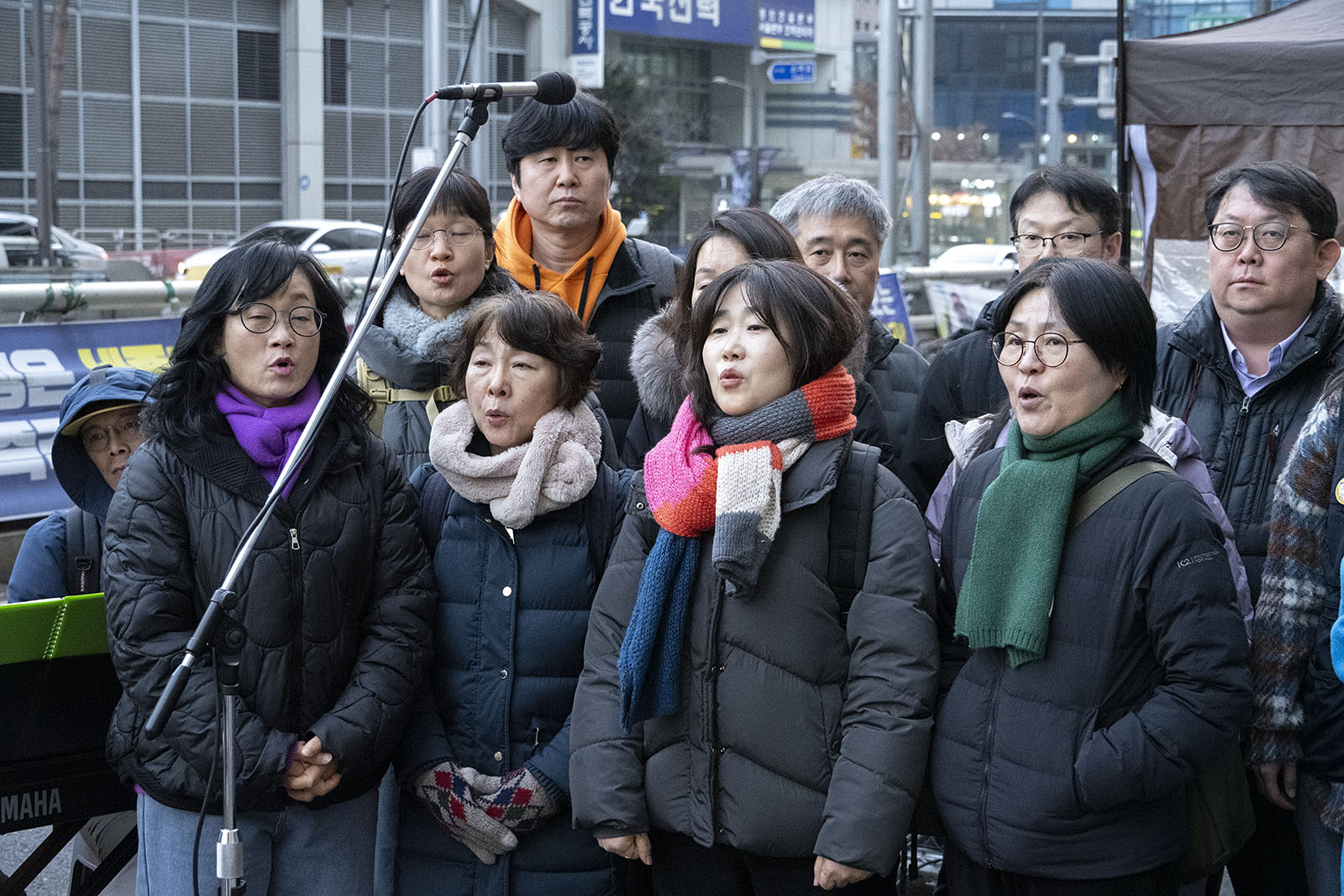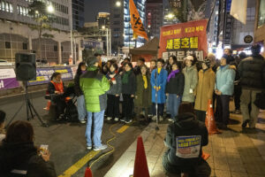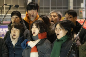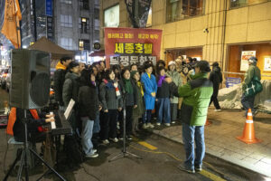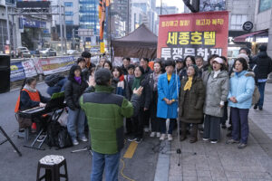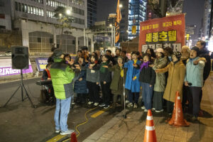 겨울 철새들이 자기장이 짚어주는 방향을 길잡이 삼아 올겨울에도 이 땅의 강과 들판을 찾아왔다. 수천 킬로미터의 아득한 거리를 날아오면서도 길을 잃지 않는다. 우리 모두 새들에게서 아름다운 비행을 본다. 세종호텔의 노동자들이 길고 오랜 싸움을 벌이고 있다. 그들 또한 허공에서 길을 찾아내는 새들이다. 보이지 않는 길을 몸으로 감지하며 방향을 놓치는 법이 없다. 이소선합창단은 허공을 날아가고 있는 노동자들의 비행에 노래로 함께 했다. 잠시 목요일마다 명동에서 열리는 노동자의 하늘을 노래가 함께 날았다.