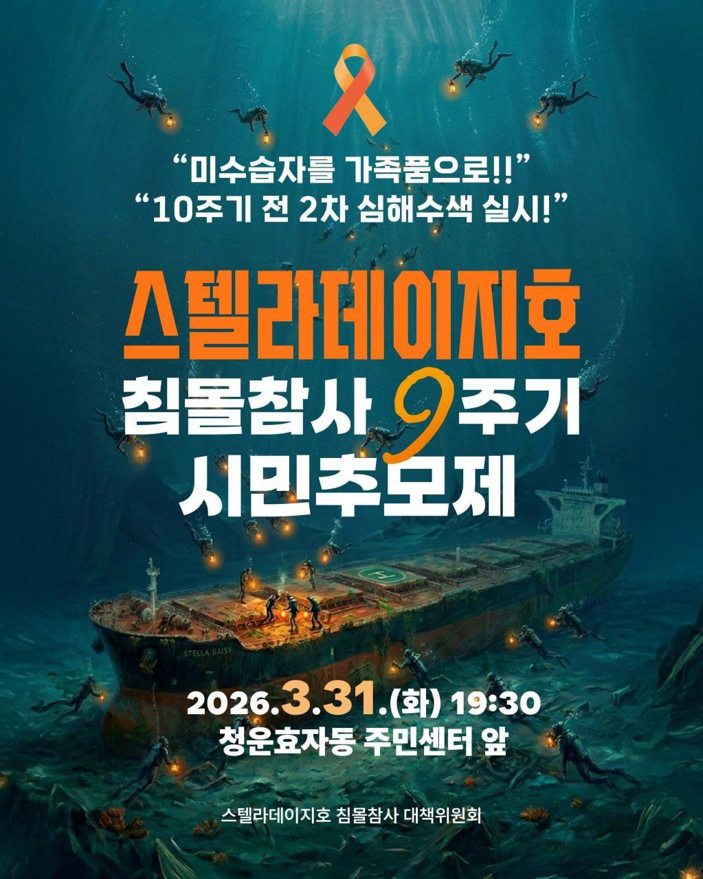2026년 3월 31일(화) 스텔라데이지호 침몰참사 9주기 시민추모제 By 윤 하영2026년 03월 20일2026년 03월 20일공연 일정 스텔라데이지호 침몰 참사 9주기 시민추모제에 이소선합창단 이 함께합니다. 잊지 않기 위해, 다시 부르겠습니다. 기다림이 끝나고 모두가 가족의 품으로 돌아오는 그날까지 이소선합창단의 노래로 마음을 전합니다. ◆ 일시: 2026년 3월 31일(화) 19:30◆ 장소: 청운효자동 주민센터 앞◆ 곡목-솔아 솔아 푸르른솔아-잘 가오 그대-그날이 오면(지휘: 임정현, 피아노: 정효) 함께 자리해 주셔서 기억해 주세요.