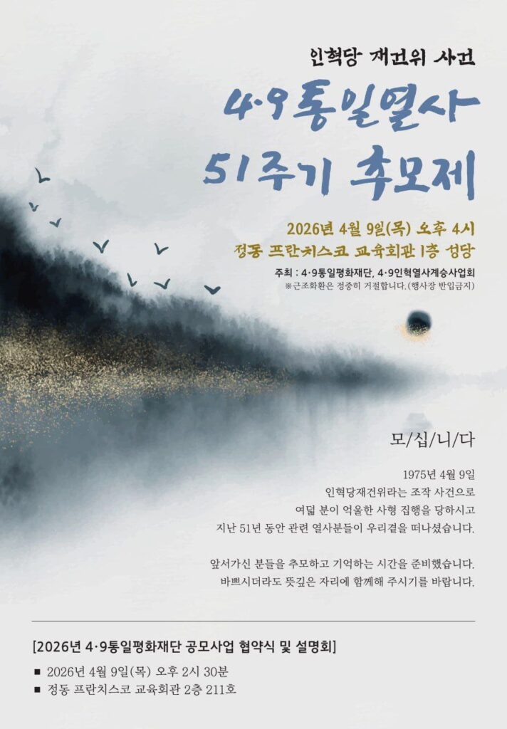 전 세계가 경악한 이 ‘사법 살인’의 비극을 우리는 잊지 말아야 합니다. 1975년 4월 9일 스러져간 분들입니다. 서도원, 도예종, 하재완, 이수병, 김용원, 현제복, 송상진, 여정남. 8분의 열사를 기억하겠습니다.